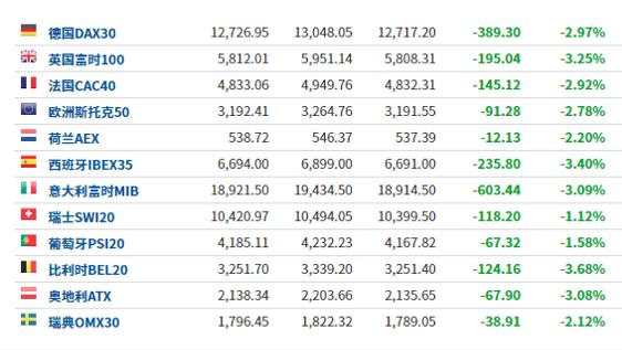 欧洲股市低开低走,截至18:45,主要股指跌幅约3%;美股期货方面也快速下跌,三大股指期货均跌超1%。