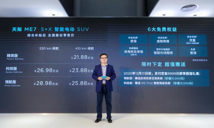 据了解,天际ME7共推出精英版、科技版、领航版三款车型,提供530km、410km 两个NEDC续航版本选择,补贴后售价21.88万—28.98万。