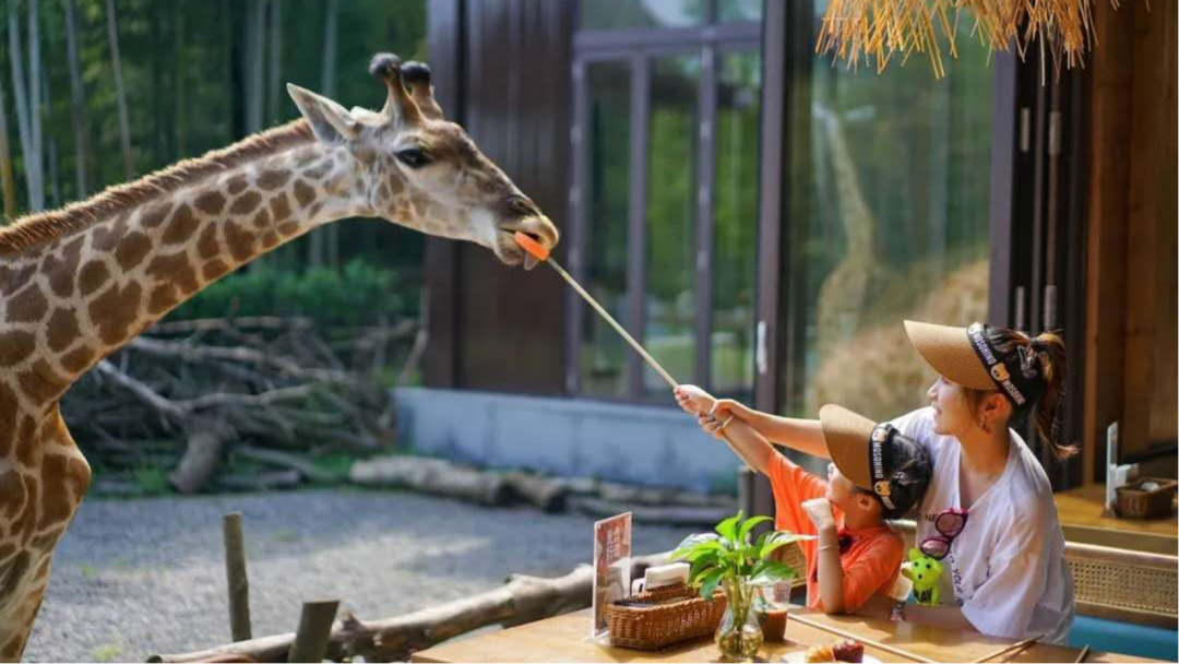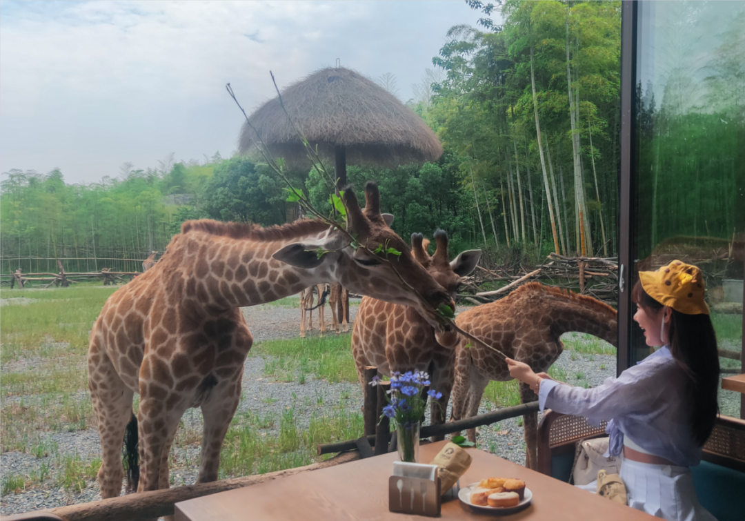 在竹林环绕的长颈鹿餐厅,呼吸着清新的空气,透过巨大的落地玻璃窗,长颈鹿萌萌的脑袋时不时探进来,像是在督促你好好吃饭。在餐厅里,可以品尝到正宗湖州地方菜,美景加美食,还有长颈鹿相伴,让人胃口大开。