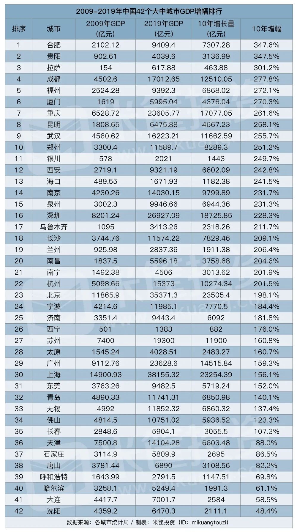 以10年的GDP增长幅度来看,在42个城市中,有35个在10年间实现了GDP翻倍,仅有7个城市的增长没达到100%。