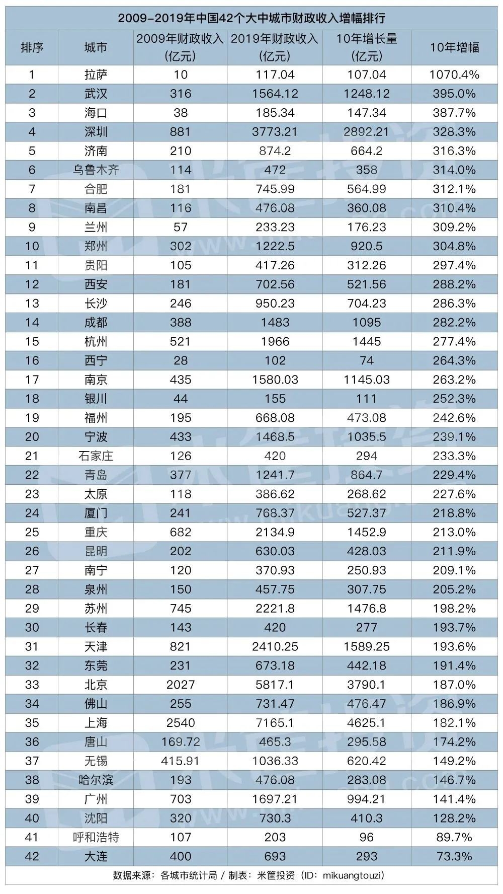 以10年财政收入的增幅来看,拉萨以10倍的增长高居第一位,但拉萨2009年的财政收入只有10亿元,基数太小了,连北京、上海的零头都不到,即便增长10倍,到2019年的财政收入也不过百亿元水平,在42个城市中排名倒数第二。
