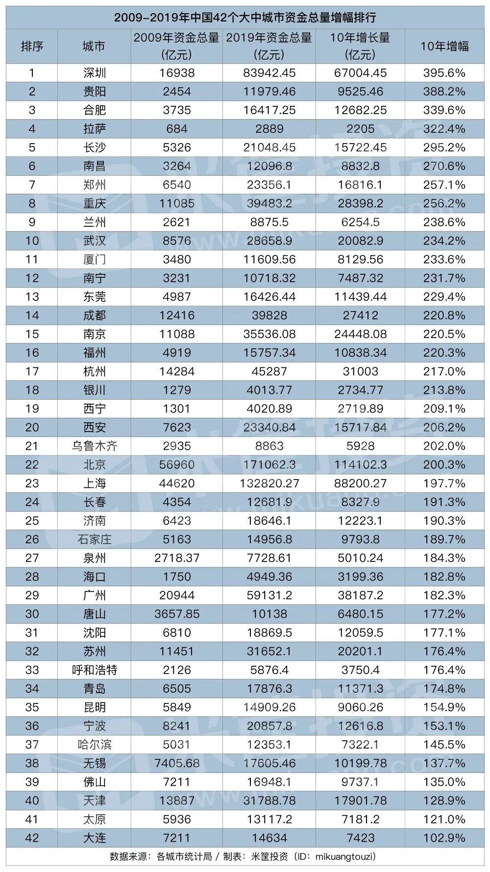 以10年资金总量的增长幅度来看,42个城市最低都实现了翻倍。