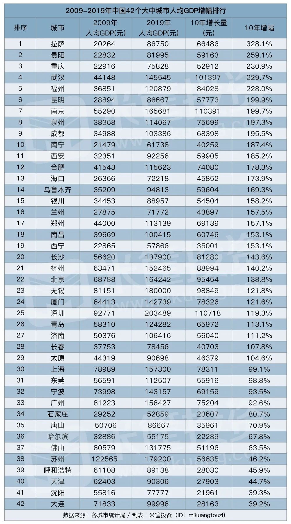 贵阳、重庆、武汉、福州这4个城市的增长幅度超过了2倍,排在二到五位。尤其是武汉和福州,2009年时都是4万左右的水平,10年的高增长到2019年时,人均GDP已经破10万元。