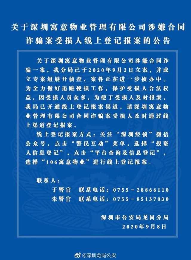 此前的9月8日,深圳市公安局龙岗分局已经发公告称深圳寓意涉嫌合同诈骗。9月9日,上海经侦ECID微博转发央视新闻微博:近日,上海多名租客和房东向警方报案称,已签协议的房屋托管公司倒闭,卷款跑路。公司以“高租金吸引房东、低租金吸引租客”方式,要求租客一次性支付大量租金,聚拢大笔租金后跑路。目前,当地警方正在调查此案。此外,律师称这种情况下房东无权强行驱赶租客,双方都是受害人,可协商处理。