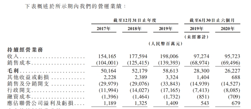 根据招股说明书显示,2017年、2018年及2019年,海尔智家的收入分别为1542亿元、1776亿元及1980亿元,年复合增长率为13.3%;同期利润分别为91亿元、99亿元及123亿元,年复合增长率为16.1%。值得注意的是,受新冠肺炎疫情的影响,海尔智家2020年上半年收入957亿元,与2019年上半年的973亿元相比减少1.6%,2020年上半年实现利润36亿元,同比减少41.6%。