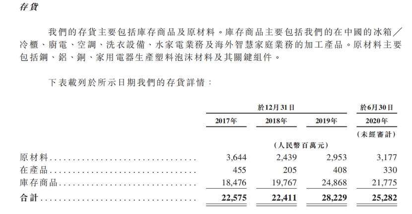 此外,海尔智家的存货金额也出现明显上升。2017年至2019年,公司存货金额分别为225.75亿、224.11亿和282.29亿,到了2020年前半年这一数字激增至252.82亿元。这进一步推高了产品的存货减值金额,各报告期内存货减值金额为5.52亿、5.56亿、5.76亿和4.12亿。