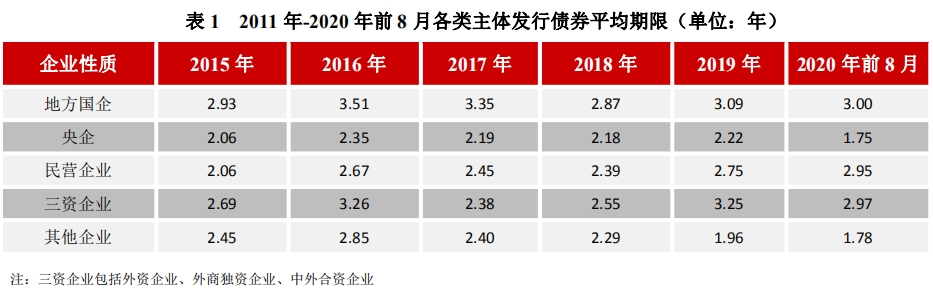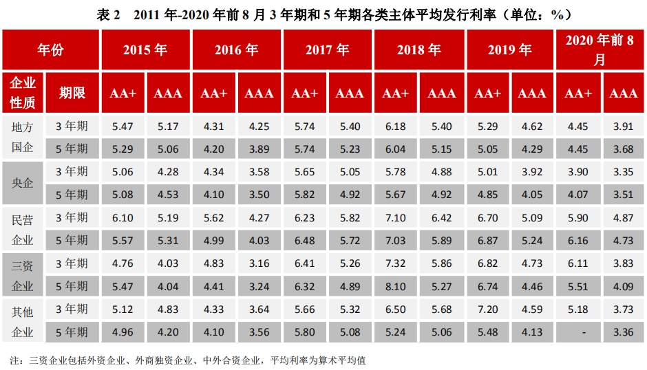 民营企业债券融资期限相比地方国企明显偏短(见表1),并且自2015年到2020年前8月间,民企债券期限没有超过10年期,而除了2019年达州发展(控股)有限责任公司发行了一只含赎回和回售选择权的10年期债券外,其他民企债券期限均在7年期以内(包括7年期),而同时期地方国企和央企10年期以上债券发行则相对较多。从发行利率来看,自2015年到2020年前8月间,民企债券平均发行利率比其他类型主体同期限同评级平均发行利率均要高(见表2),尤其是比央企和地方国企要高。比如,2020年前8月期间,3年期AAA级民企债券平均发行利率比地方国企高96BP,比央企高152BP;5年期AAA级民企债券平均发行利率比地方国企高105BP,比央企高122BP。相比银行贷款,债券市场更适合企业进行长期限融资,民企债券融资期限较短、发行利率较高,虽然受到了多重因素的影响,但也反映出民企融资难的困境。由于难以从债券市场获得较长期限和融资成本较低的资金,民企长期发展所需资金可能难以得到满足,这将不利于民企长远的发展。