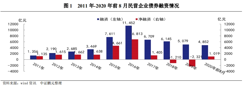 自2011年到2020年前8月近十年间,民营企业债券融资经历一个上升到下降的过程,以2016年为界,之前民企债券融资逐年攀升,到2016年超过1.1万亿元,民企债券占非金融企业信用债发行之比从2011年的5.77%上升到2016年的13.15%,达到高峰,随后民企债券融资规模逐渐萎缩,到2019年民企债券融资相比2016年下降55.65%,不仅民企债券占比持续下降,到2019年民企债券占比仅5.25%,而且2018年和2019年民企债券净融资规模也持续为负,分别为-1209.82亿元和-2320.65亿元,直到今年3月,由于受到宽松货币政策因素影响,净融资规模才开始扭负为正。与民企债券融资萎缩形成鲜明对比的是,国有企业债券融资2019年比2016年增长了37.79%,净融资规模增长了13.98%,占比从2016年的81.02%上升到90.73%,这表明债券融资越来越向国企集中。民营企业近年来债券融资萎缩,既是由于宏观风险上升,市场对民企债券风险重新定价所导致,也与民企违约上升、信用风险加剧密切相关。