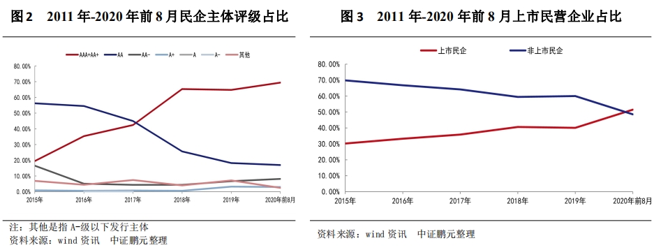 2、风险规避下,民企发行主体向高信用等级和上市公司集中