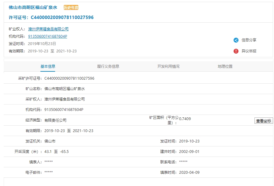 小食代翻查公开资料还留意到,在2015年,福山拟以50万元把自己的天然矿泉水采矿权转让给漳州伊莱福,并就此签订了转让合同。而据自然资源部官网显示,该矿山目前的采矿权人仍为漳州伊莱福,有效期限为2019年10月23日至2021年10月23日。