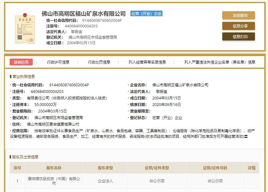 据工商资料显示,福山成立于2004年,经营范围包括持有效审批证件从事食品生产(矿泉水、山泉水、食品包装、容器、工具等制品),仓储服务(除化学危险品及易制毒化学品),动产设备租赁服务和装卸劳务服务等。