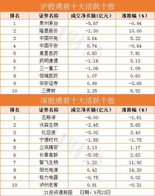 个股方面,五粮液(00858.SZ)、贵州茅台(600519.SH)、长春高新(000661.SZ)、比亚迪(002594.SZ)净卖出居前,分别获净卖出6.00亿元、5.67亿元、5.05亿元、3.02亿元,合计19.74亿元。