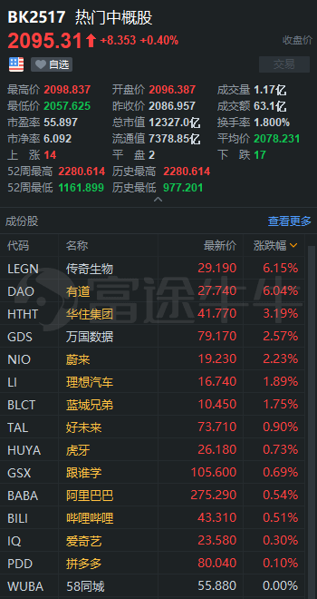 热门中概股方面,共14只股票上涨,17只股票下跌,2只股票收平。