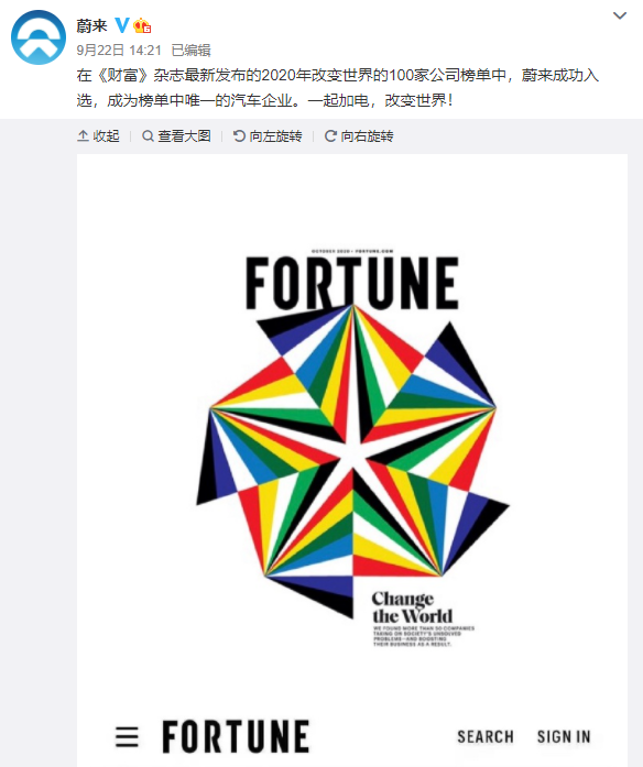 蔚来入选《财富》杂志2020年改变世界的100家公司榜单