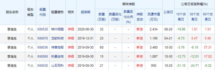 另据上市公司定期报告股东数据显示,李连生还曾出现在多家科创板新股股东名单中。