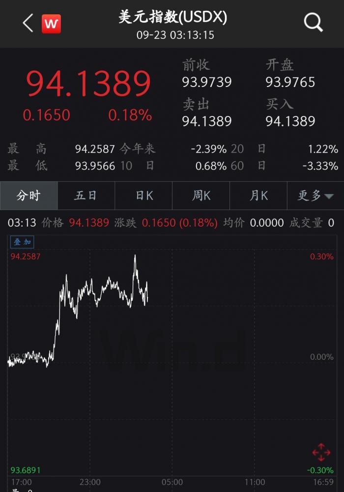 9月23日,美元指数突破94关口,最高至94.2587。当日,人民币中间价报6.7986,下调114点,上一交易日中间价报6.7872,在岸人民币上一交易日收报6.7875。