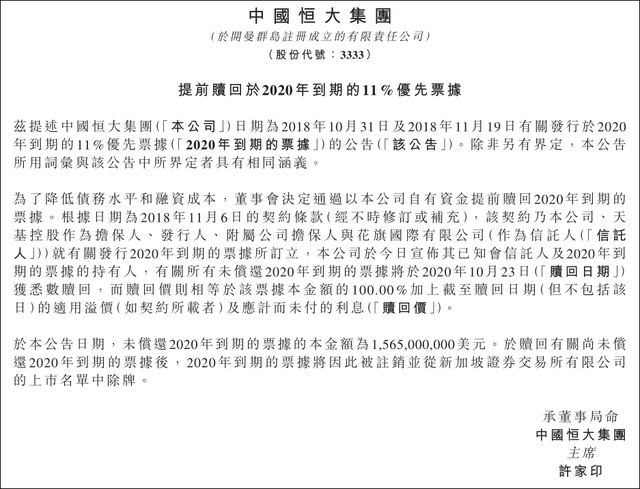 9月16日,中国恒大发布公告,将使用自有资金提前偿还15.65亿美元优先票据,折合人民币106亿元提前偿还额度,创下香港资本市场纪录。