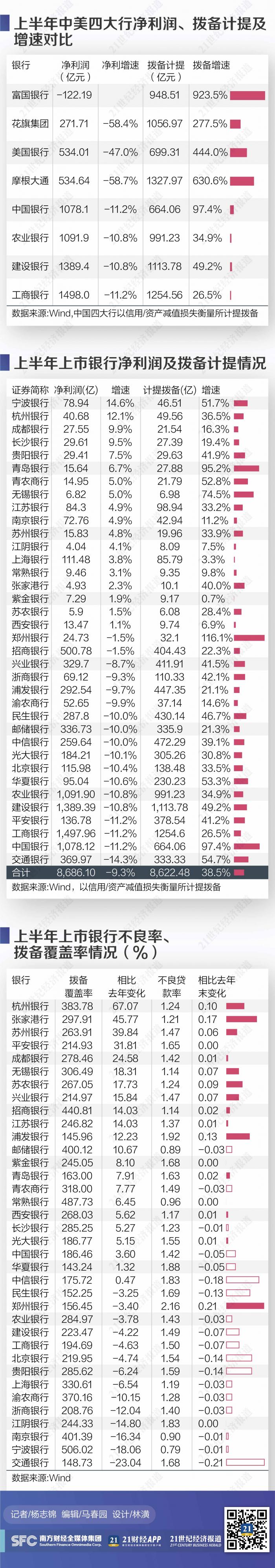 Wind数据显示,上半年36家上市银行合计实现净利润8686.10亿元,相比去年同期下降9.3%;上半年计提的拨备合计8622.48亿元,相比去年同期上升38.5%。