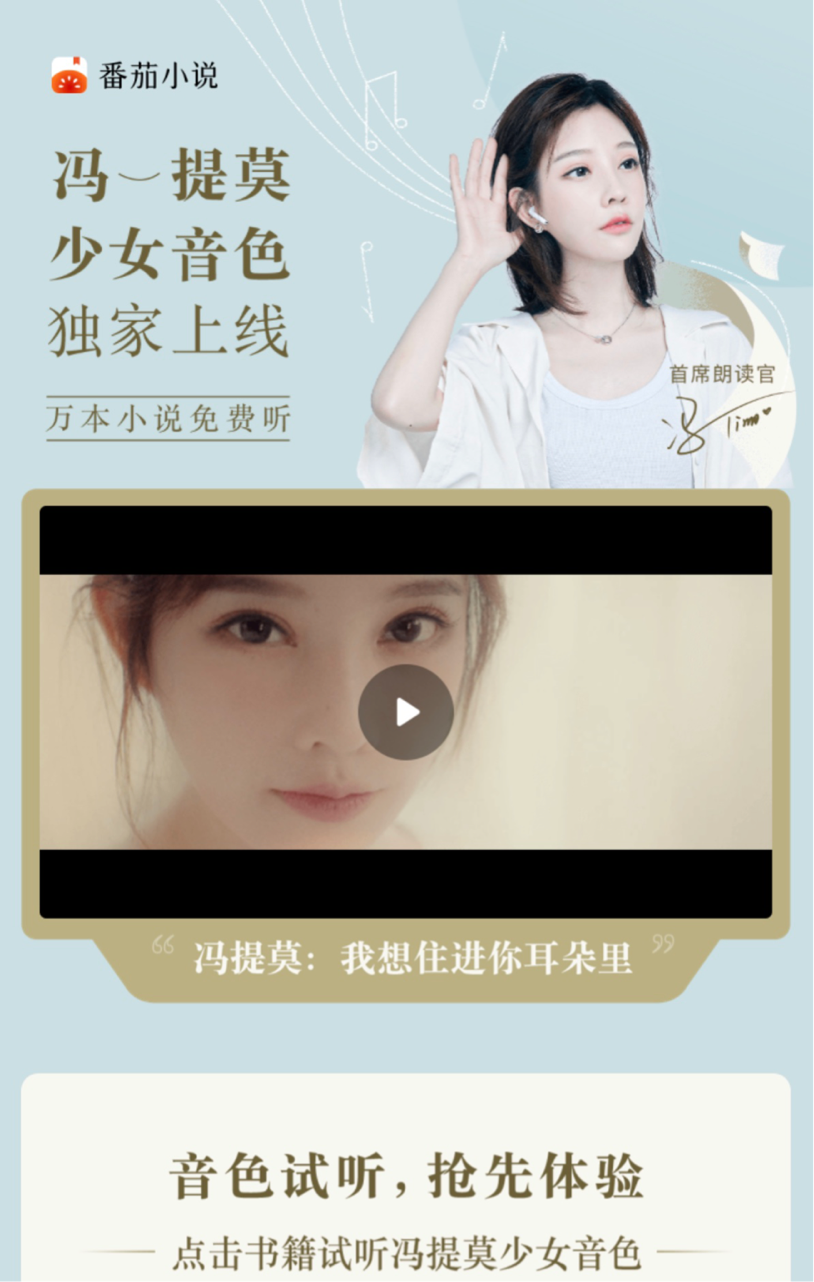 紧随七猫的免费网文平台是字节跳动旗下的番茄小说,虽然与抖音是同门师兄弟,按理说应该有极好的短视频扶持资源,但番茄小说今年的侧重点似乎放在了在听书板块上。番茄听书榜单第一《萌宝找上门:妈咪请签收》拥有两千多万热度,与其他平台上生硬的AI语音不同,番茄的AI语音非常自然流畅,近日又引入了头部主播冯提莫作为首席朗读官。