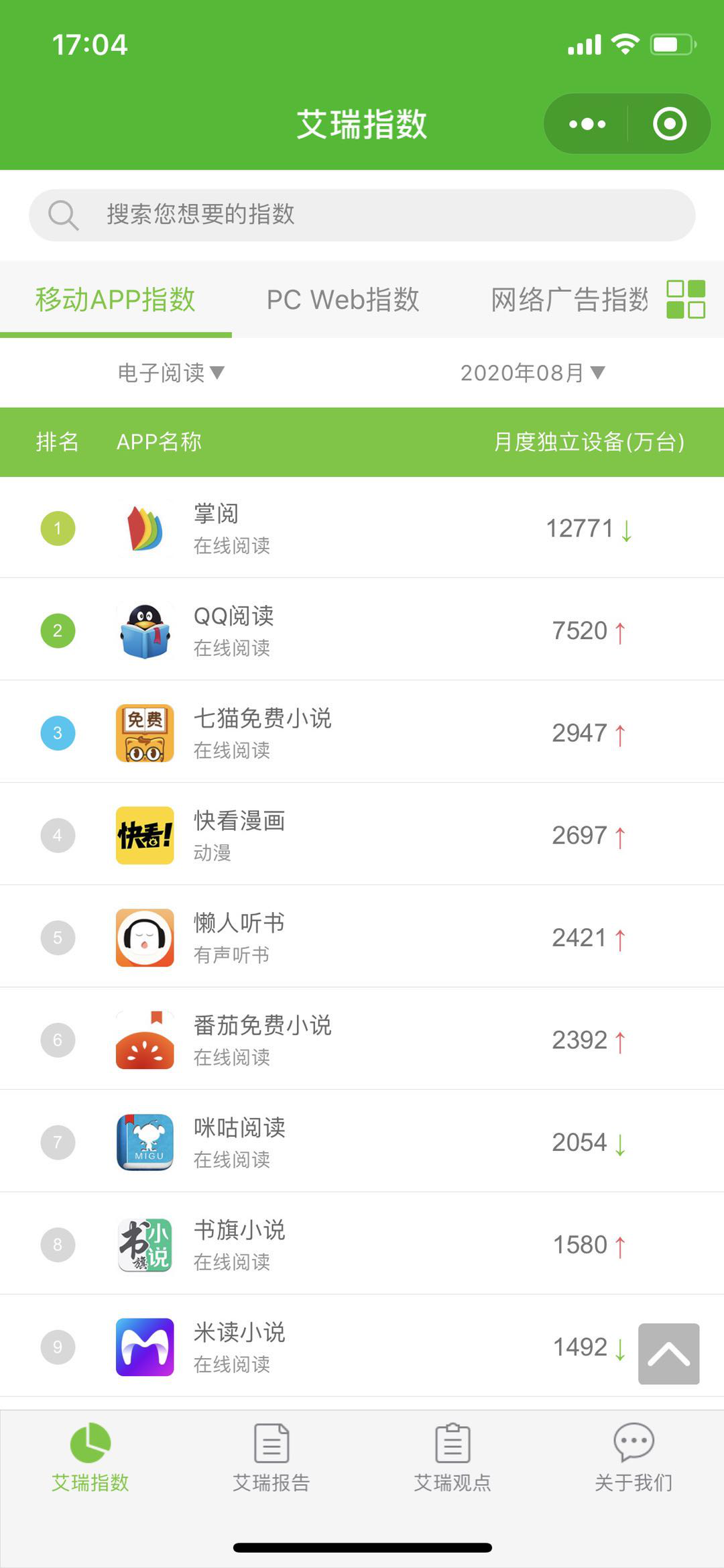根据艾瑞指数显示,在电子阅读类的移动APP排名中,前四十位里三分之一缀有【免费】字眼。其中包含了大批免费网文小说App:七猫免费小说、米读小说、番茄免费小说、连尚免费读书,疯读小说,飞读小说。