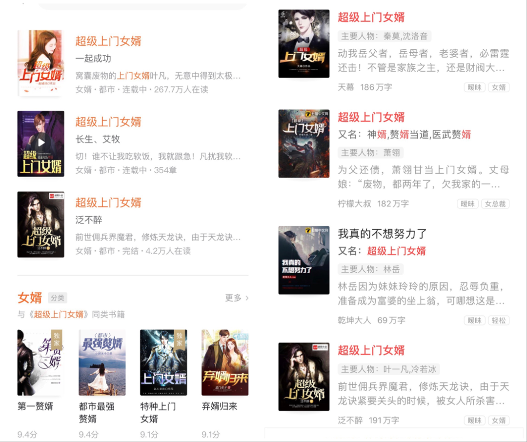 确实,在这些免费网文平台上,充斥着大量诸如《上门女婿》、《上门龙婿》、《上门狂婿》、《超级上门女婿》、《神级上门女婿》、《超级女婿》、《女神的超级赘婿》、《女神的上门贵婿》等女婿系列。