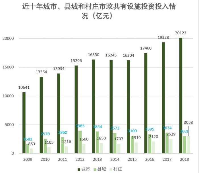 显然,这也意味着城市的开发、建设和维护资金的总量可能会有所减少。其中,县城的发展资金最值得关注。21世纪经济报道注意到,根据住建部《2018城乡建设统计年鉴》,2018年村庄市政公用设施投入(固定资产投资)达到了3053亿元,已经在该年鉴统计的历史范围内上首次超过了县城,显然,县城的建设资金投入会进一步压减。