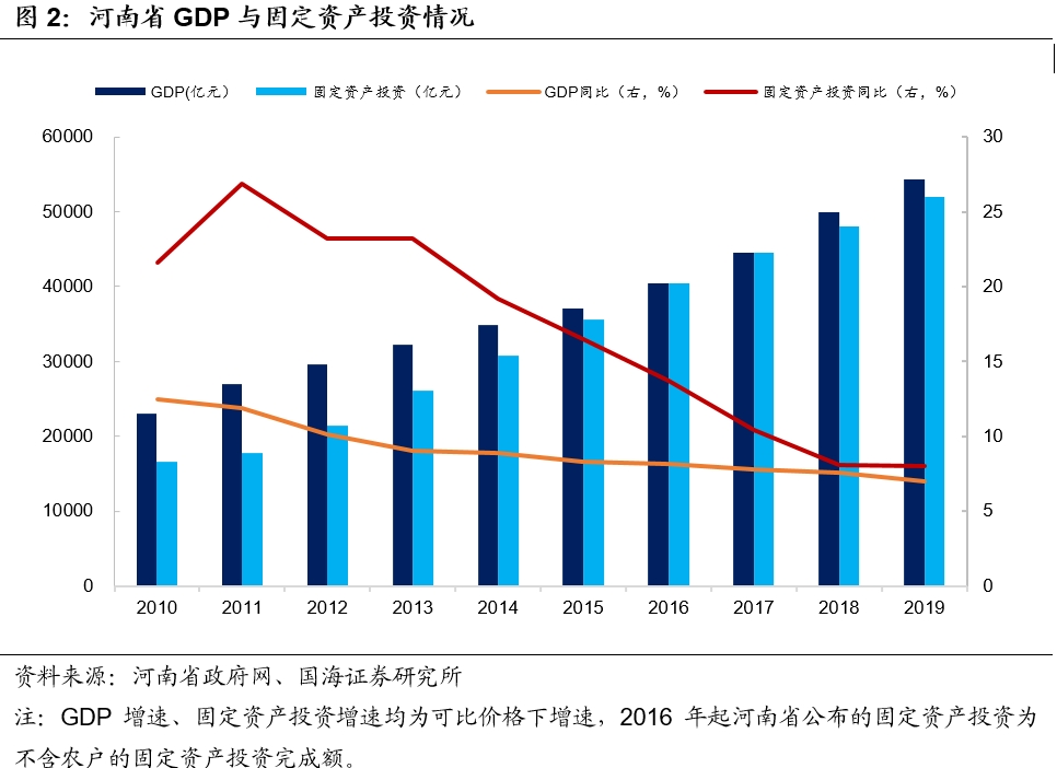 在中原城市群发展规划之下,河南省经济快速发展。2019年河南省实现5.43万亿,规模次于山东省浙江省,位居全国第五位。从经济增速上来看,2019年河南省GDP同比增长7.0%,高于全国GDP增速0.9个百分点。受人口基数的影响,2019年河南省人均生产总值56388元,比上年增长12.4%,增速有所提升。2019年河南省完成固定资产投资5.19万亿,比上年增长8.0%。