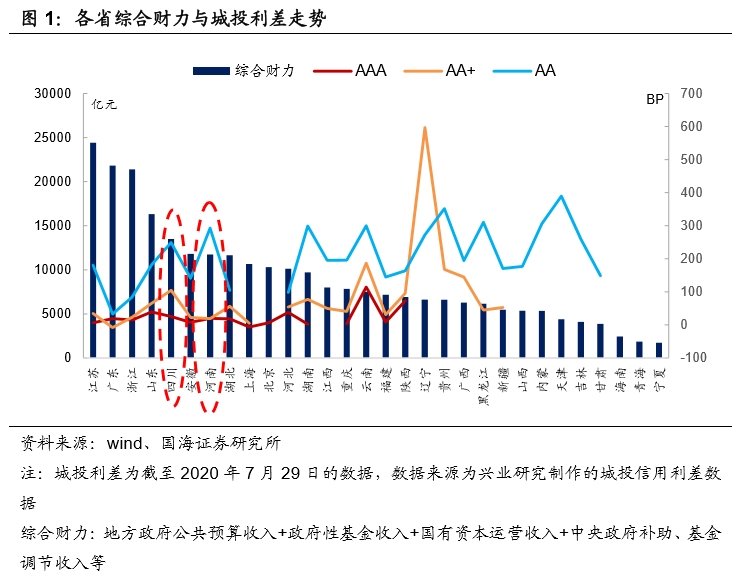 为了寻找更具有投资价值的城投标的,我们首先梳理了各省政府的综合财力,并基于不同等级的城投债利差进行对比。除云南和陕西外,各省AAA级城投平台信用利差几乎没有出现明显的偏离。但AA+级特别是AA级出现了比较明显的分化,除了云南、辽宁和贵州、黑龙江和天津信用利差较高外,在综合财力较高的省份中,四川和河南AA级城投平台利差也明显高于其他省份。整体来看,随着中原经济群的稳步发展,利差水平较高的河南城投平台或更具有挖掘机会。