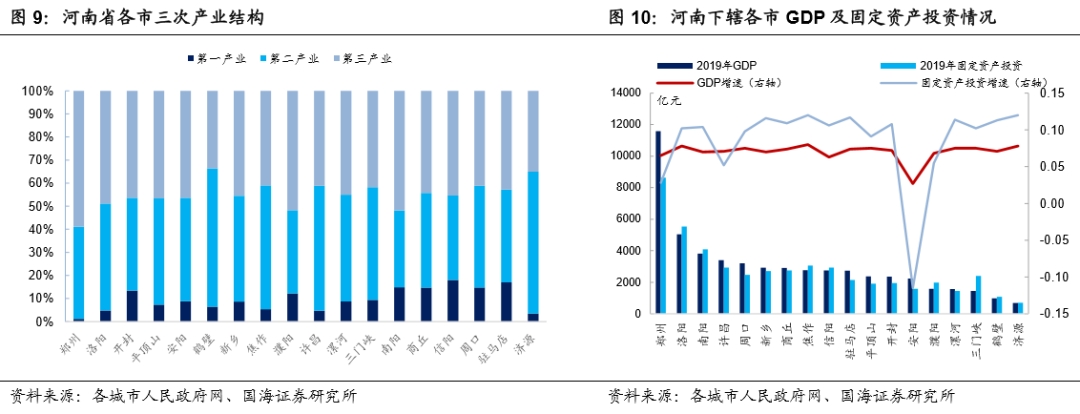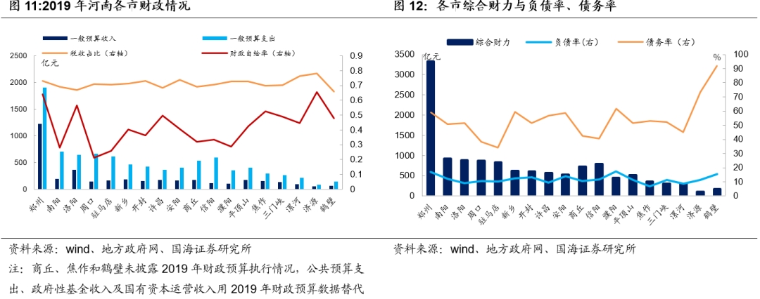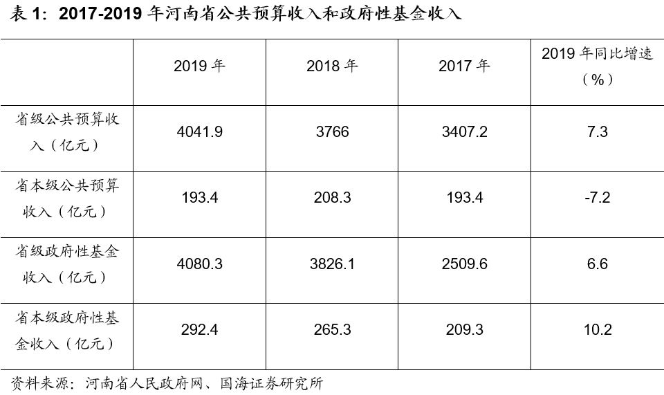 河南省地处中国中心区域,位于中原经济群的核心区域。在中原城市群发展规划之下,河南省经济快速发展。经济总量方面,2019年河南省实现GDP5.43万亿,次于山东省和浙江省,位居全国第五,同比增长7.0%;实现固定资产投资5.19万亿,比上年增长8.0%。财政实力方面,2019年河南省一般公共预算收入4041.9亿,一般公共预算支出10176.3亿元,分别位居全国第8位和第5位。税收收入占比70.3%,财政自给率39.7%。债务负担方面,2019年末河南省政府债务余额7910.1亿,债务率位于全国中游水平,相对可控。