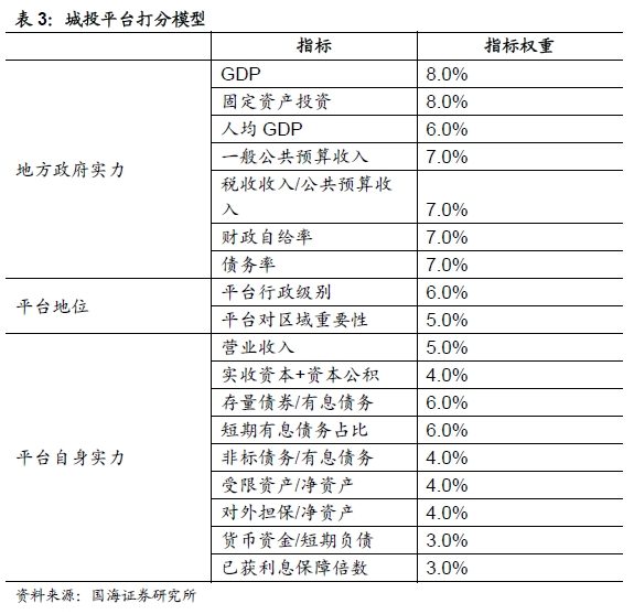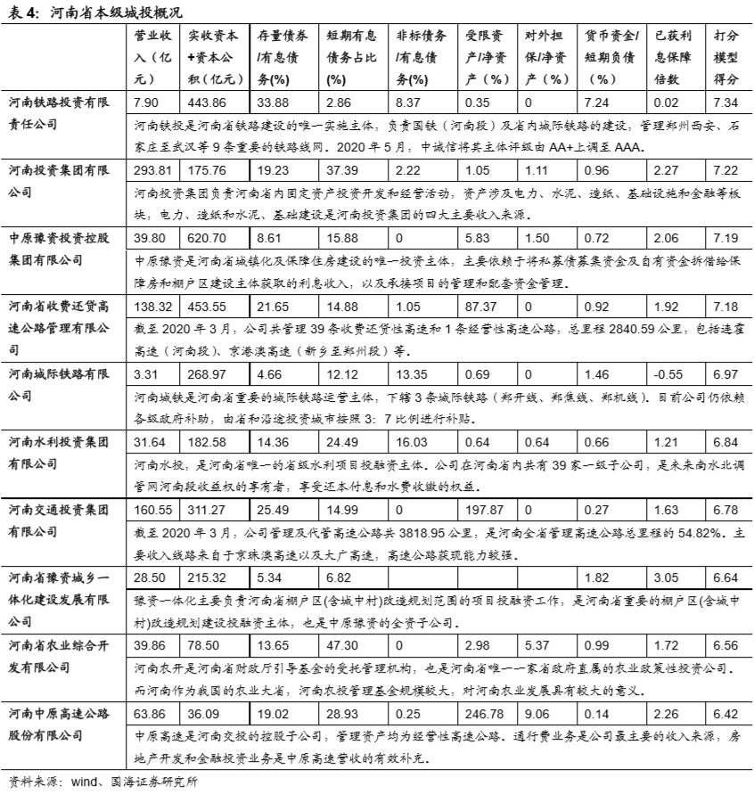 为了更好的衡量城投平台的资质,我们基于政府实力、城投平台的重要性和意义以及城投平台自身情况,选取了18个指标。基于各城投平台相关数据,我们将各项数据评分划分为10档,并在此基础上,对河南省城投平台搭建了打分模型。具体来看,各城投平台评分结果相对集中,其中河南铁投、豫投资打分结果相对较高,而河南农开和中原高速则资质相对较弱。