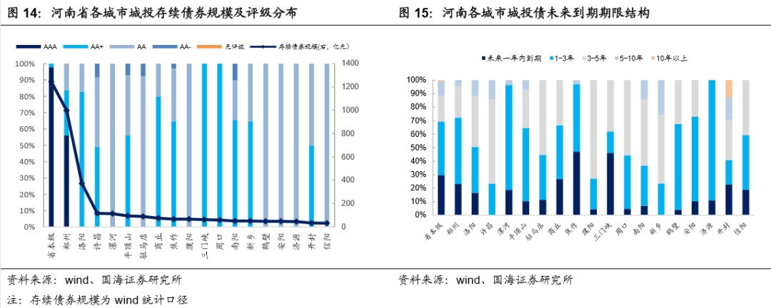 从到期兑付压力上来看,省本级和焦作市在未来一年内的集中兑付压力较大,分别占存续城投债规模的29.7%和47.0%,而郑州、漯河、平顶山、鹤壁、安阳和济源市则在未来1-3年的到期压力较大。