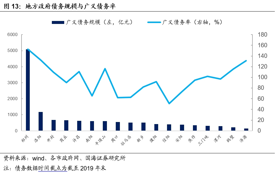 以(地方债务余额/地方政府综合财力)为债务率的衡量指标,鹤壁的债务率最高,为91.9%,郑州和鹤壁的债务率均在60%以上,分别为73.4%和61.7%。