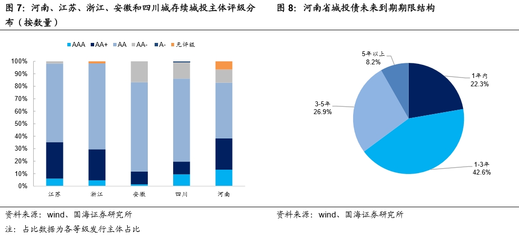 相比之下,江苏、浙江等经济非常发达的省份,以及四川、安徽这两个综合财力与河南相当的省份,AA及以下评级城投平台占比都比较高,基本接近80%。而河南资质较差平台债券则由于发行难度相对较高,占比相对较低。