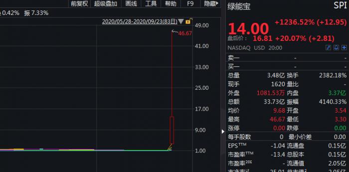 绿能宝[SPI.O],前一日收盘价还仅有1.05美元,但是昨夜盘中却最高上涨至46.67美元,盘中最大涨幅超过4000%。至收盘,报收14美元,但是总市值仍然不过2.05亿美元。