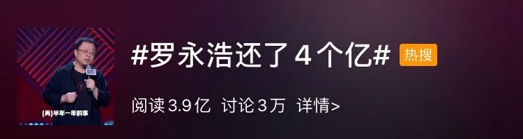截至9月24日中午13时,热搜话题#罗永浩还了4个亿#已引发3万人次网友讨论,阅读量达到3.9亿。
