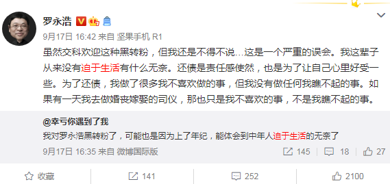 之前罗永浩在微博称只要钱给够,婚丧嫁娶主持之类的工作也可以做,还债很重要。有网友解读为,罗永浩说这话是因为迫于生活的无奈。罗永浩对于网友的解读表示,这是严重误会。