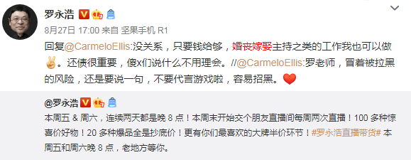 罗永浩及其直播公司近来动作频频。7月14日罗永波官宣将以领笑员身份正式加盟笑果喜剧网综《脱口秀大会》。同日,罗永浩微博官宣其旗下五名年轻主播将在淘宝直播开启直播带货首秀,而罗永浩本人则继续留在抖音直播。