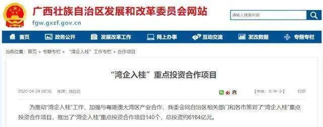 广西投资促进局局长杨春庭曾表示,“三企入桂”行动中,粤港澳大湾区仍是广西最大的外来投资来源地,“湾企入桂”助力广西打造大湾区科技成果转化承接区。