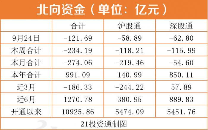 ·北向资金疯狂出逃百亿 9月24日,受美股隔夜大跌影响,A股三大指数低开低走,沪指收跌超1.7%,深成指、创业板指均跌超2%。两市行业板块全线下跌,个股跌多涨少,市场情绪陷入冰点。双节临近,北向资金继续减仓回避不确定性。今日北向资金全天单边净流超过121亿元,这是7月27日以来首次单日流出超过百亿。截至9月24日,北向资金已经连续四日净流出,合计流出净额达到234.18亿元,流出力度较大。详情>>(南财号·投资情报)