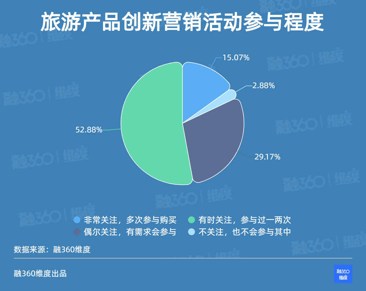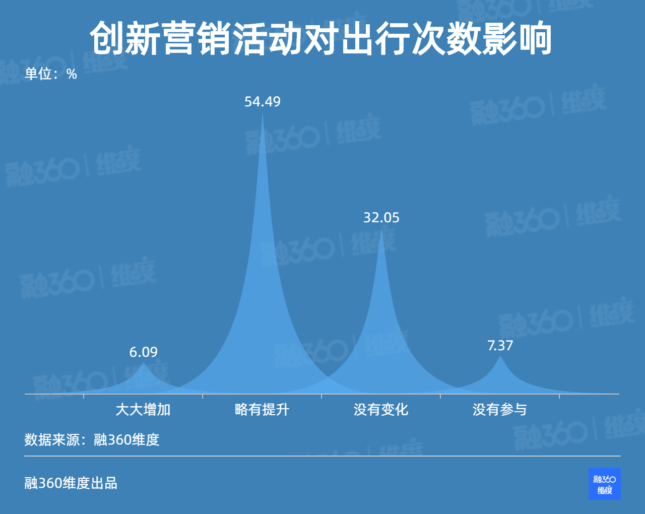 这些创新营销活动对旅游市场的复苏有没有作用呢?融360维度调查结果显示,54.49%的受访者表示,自己的出行次数相比以往略有提升;6.09%的受访者表示,出行次数大大增加。这意味着,超六成受访者在创新营销活动刺激下,增加了出行安排。