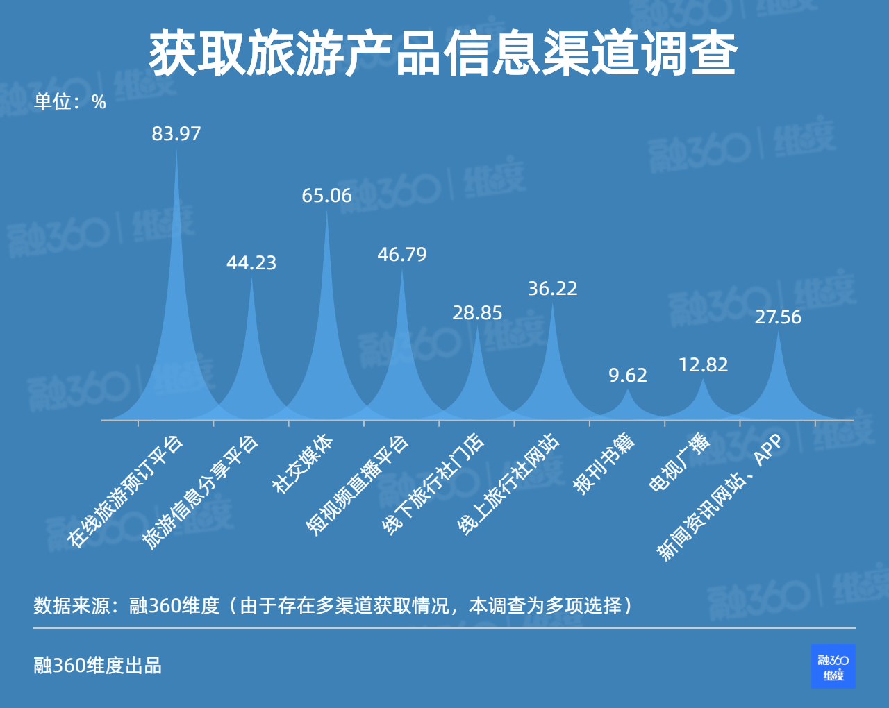 融360维度调查数据显示,在线旅游预订平台仍然是大众获取信息、购买旅游产品的最主要渠道,超过八成的受访者表示使用过该渠道。