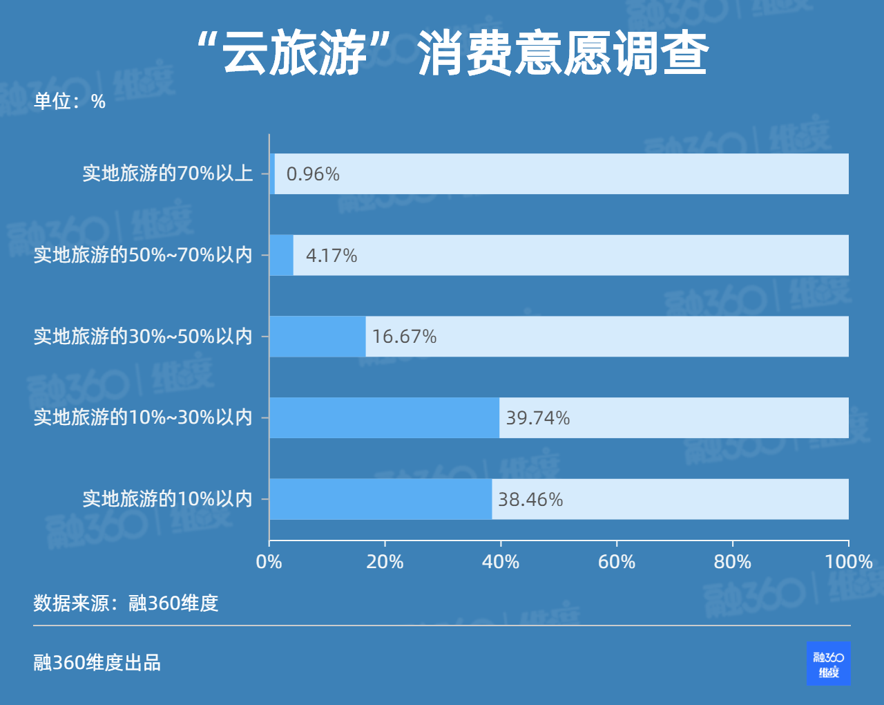 对于“云旅游”的消费意愿,融360维度调查发现,愿意为“云旅游”支付实地旅游费用的10%以内和10%~30%以内水平的受访者,占比分别达到38.46%和39.74%;另外,有超过两成的受访者表示,愿意为“云旅游”支付实地旅游费用的30%以上。