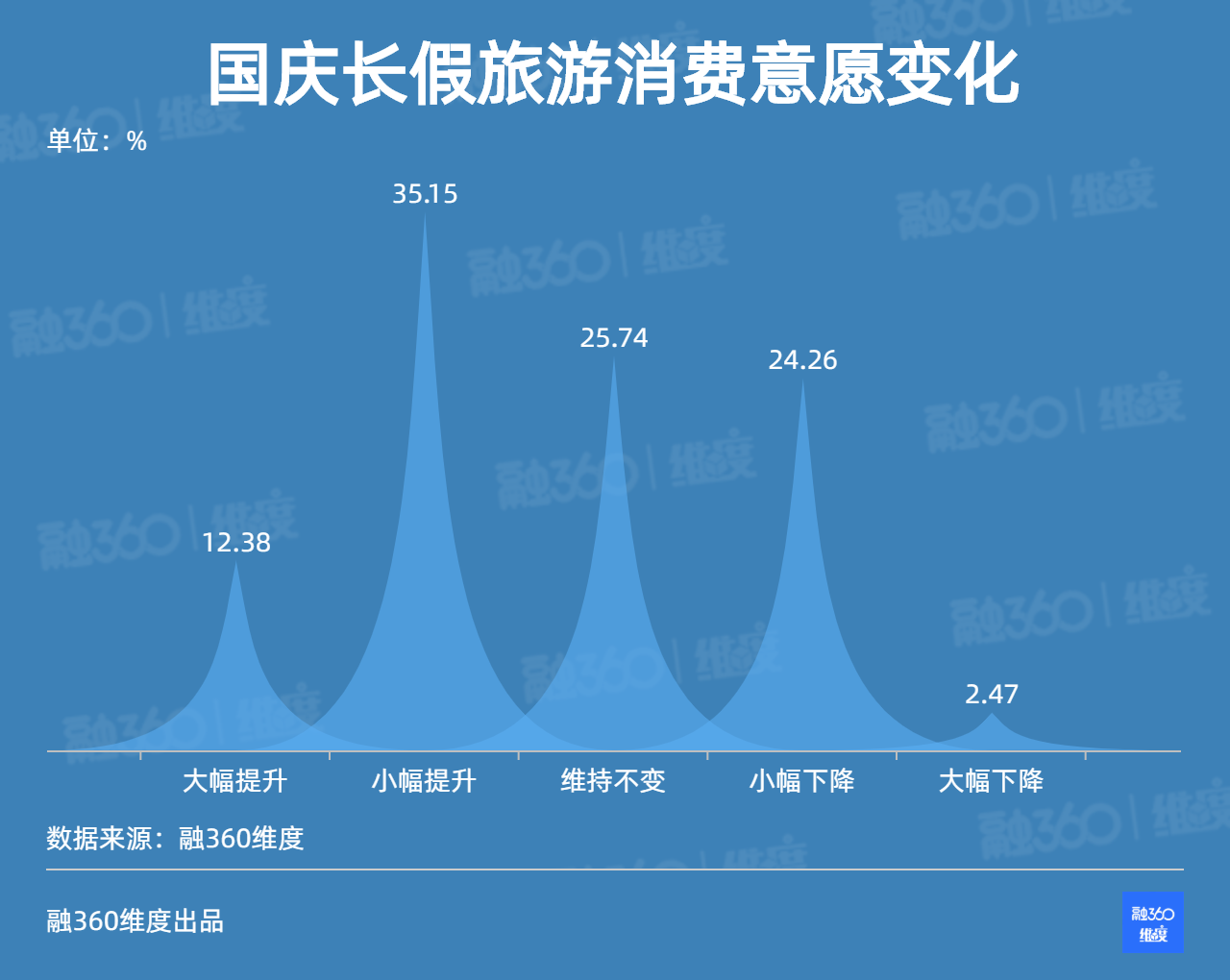 融360维度调查发现,35.15%的受访者表示,相较于往年,今年国庆长假旅游消费意愿会小幅提升;12.38%的受访者表示会大幅提升消费力度。这意味着,今年国庆长假接近半数的受访者将扩大消费,这对身处困局的旅游业而言,无非是个利好。