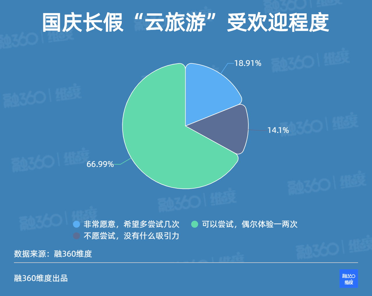 融360维度调查发现,国庆长假期间“云旅游”市场仍然有不小空间,66.99%的受访者表示,愿意偶尔体验一两次“云旅游”;18.91%的受访者表示,非常愿意体验“云旅游”,希望多多尝试;只有14.1%的受访者表示,对“云旅游”没有兴趣。