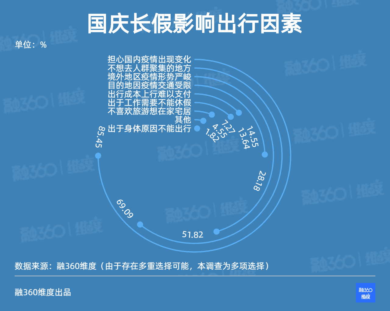 在调查中,高达35.26%的受访者表示没有出行安排,是什么因素影响了他们的出行决策呢?融360维度调查数据显示,“担心国内疫情出现变化”、“不想去人群聚集的地方”和“境外地区疫情形势严峻”是影响受访者出行的最主要因素,均与疫情相关。