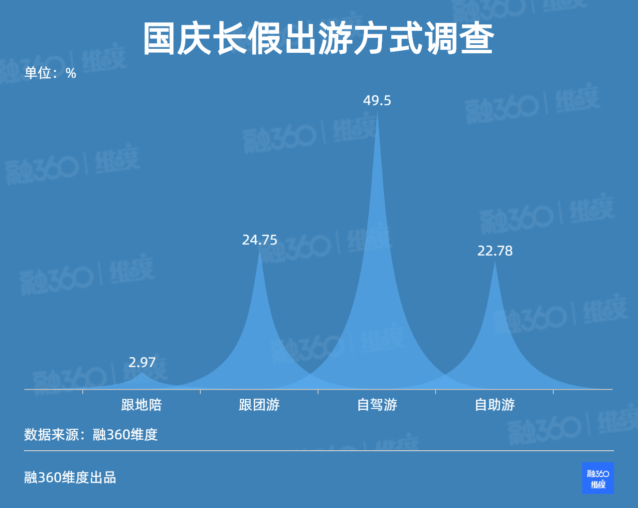 融360维度调查发现,49.5%的受访者表示,今年国庆长假将选择自驾游。此外,选择跟团游、自助游和跟地陪的受访者比例分别为24.75%、22.78%和2.97%。