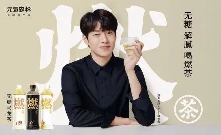 在气泡水之前,元気森林先推出了燃茶。以减肥成功的明星魏大勋等人为代言人,燃茶塑造了“喝了可以帮助燃烧热量并实现减肥”的产品形象。在广告视频中,魏大勋吃完油腻的烤肉后立刻饮用燃茶。