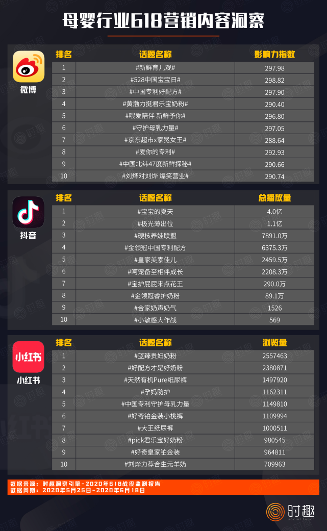 乳业品牌热衷联合权威部门及名人为其背书,话题影响力处于领先地位;在抖音上,多个乳制品、纸尿裤品牌以剧情植入、生活场景等方式进行推广,通过鼓励用户记录亲子生活从而吸引大量作品参与,获取了最多播放量;小红书平台则以618购物清单、带娃生活分享和孕期瑜伽内容形式触达宝妈和汲取经验的准妈妈人群,其中出行安全工具受到宝妈关注,母婴营销话题以宝宝日常消耗品的奶粉和纸尿裤品类为主。