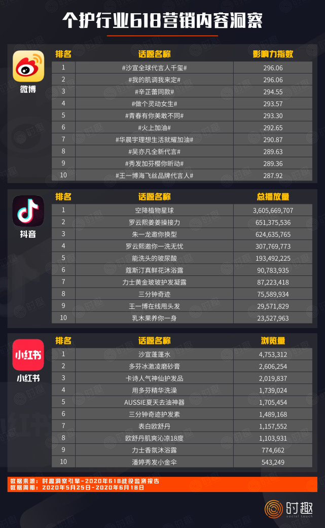 从美妆行业来看:根据时趣洞察引擎数据显示,618期间,以美妆为例,品牌营销战役影响力排名top10中,可以看到以明星为核心展开的营销战役和围绕产品展开的场景化战役相对排名靠前。一方面在微博平台,通过官微带话题官宣,为话题带去较多流量,另外借助明星效应助力提升品牌话题影响力;在抖音平台,官方发起视频挑战活动吸引网民参与话题互动;在小红书平台,KOL亲测产品效果展现产品功效,评价产品对消费者具有较强吸引力,通过分享护肤、美妆攻略自然融入产品信息也是宣传产品的一种有效方式。