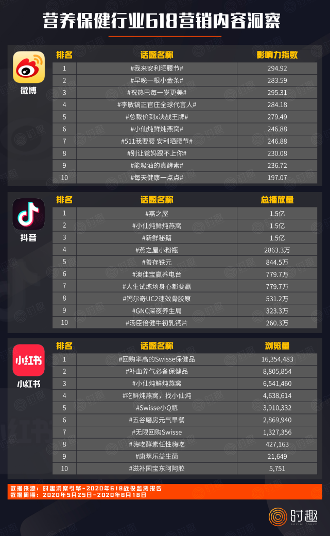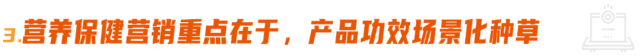 总的来说,营养保健行业更加侧重围绕产品功效进行话题、场景营销。